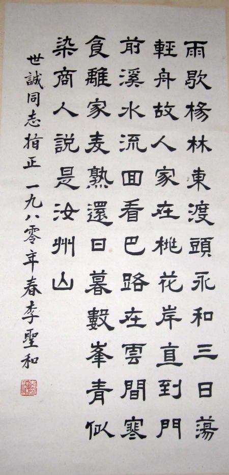 李圣和扬州人。名惠,号印沧。现代女书法家。出生于诗书名门,家学渊源,擅书画,能诗文。意之所适,笔亦随之,发意吐语,端庄凝重,尤以抗战时期所作,慷慨激昂,有赤子之心,无闺阁之气。毕生所作,积稿盈筐。画宗宋元,兼师南田、新罗,并受扬州八怪影响,汇而融之,独具一格。工笔、写意兼长。工笔勾勒精细,浓描淡写,柔中寓刚,着色浑厚,染晕自如。写意笔墨清秀苍润,用色洁净明丽。书法精于楷隶。楷书圆劲遒逸,隶书沉着浑厚。面对其书,古拙灵秀,清气徐来。曾任江苏省第五届政协委员,中国书法家协会会员。1983年被授予扬州市“三八红旗手”称号。留有《李圣和诗书画集》、《李圣和诗词集》等。